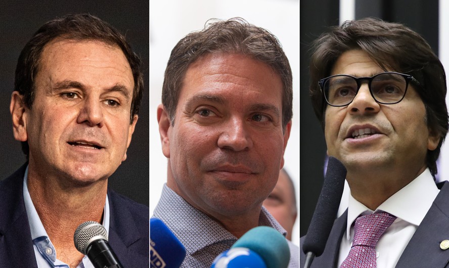 Da esquerda para a direita: o prefeito do Rio,Eduardo Paes (PSD); o candidato à prefeitura carioca Alexandre Ramagem (PL) e o deputado federal Pedro Paulo (PSD-RJ),cotado para a vice de Paes — Foto: Fotos de Hermes de Paula/O Globo,Bia Orle/O Globo e Mário Agra/Câmara dos Deputados