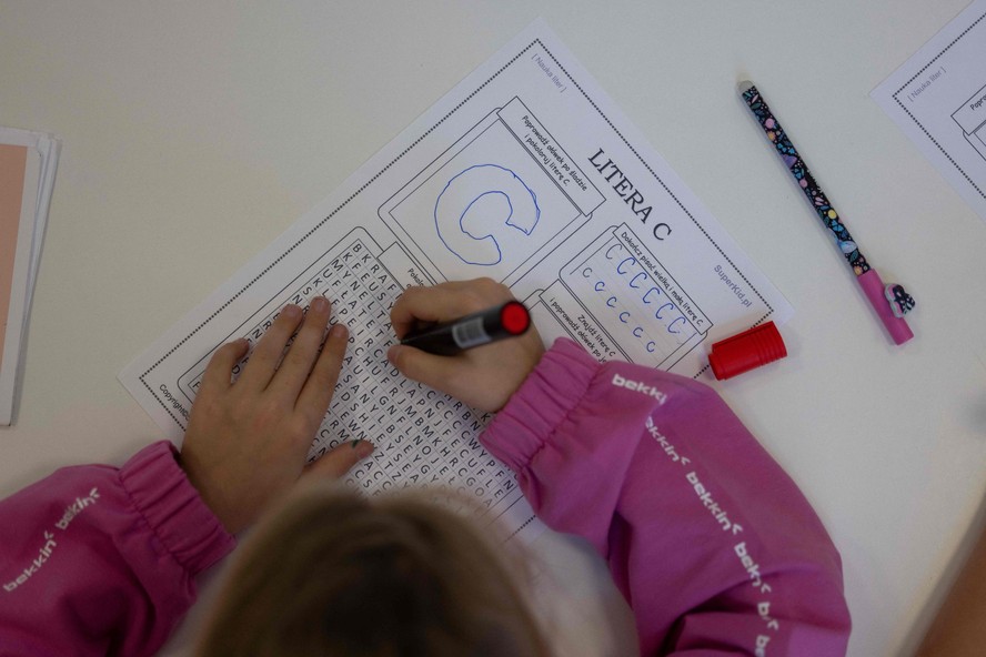 Criança ucraniana faz exercício durante aula em escola na Polônia — Foto: Wojtek RADWANSKI / AFP