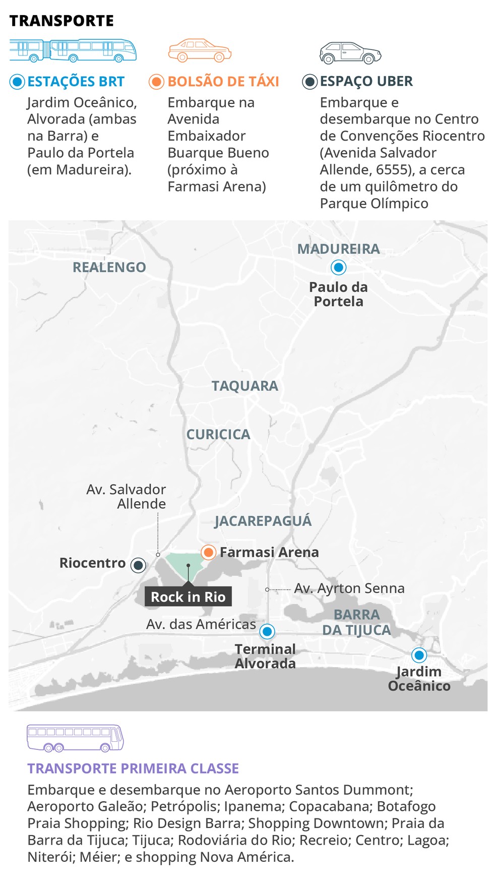 Opções de transporte para o Rock in Rio: destaque para transporte público.