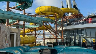 Quando fizer sua estreia em Miami em abril,o MSC World America se tornará o oitavo maior navio de cruzeiro do mundo,acomodando quase 7.000 passageiros. A escala e o escopo do navio podem ser sentidos no passeio ao ar livre,a localização da peça central da embarcação — um escorregador de 11 andares de altura. A popa do navio é em formato de Y,permitindo espaço para mais cabines com varanda e vistas panorâmicas do mar.