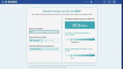 Uma ferramenta desenvolvida pelo GLOBO permite verificar no mapa onde estão alocadas as especialidades médicas por município. Além disso,um site especial mostra o tempo médio de espera para consultas e cirurgias no SUS por estado. Conforme reportagem do jornal,o tempo médio para atendimento atingiu um patamar recorde após a pandemia de Covid-19.