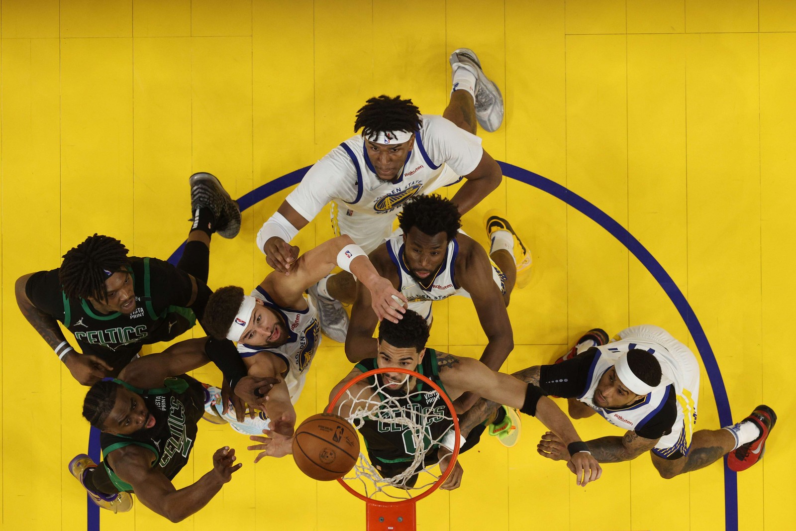 Jayson Tatum,Jaylen Brown e Robert Williams,do Boston Celtics,competem pelo rebote contra Klay Thompson,Kevon Looney,Andrew Wiggins e Gary Payton,do Golden State Warriors,durante o terceiro quarto do jogo cinco das finais da NBA de 2022,no Chase Center,em 13 de junho,em San Francisco,Califórnia. — Foto: Ezra Shaw/Getty Images/AFP