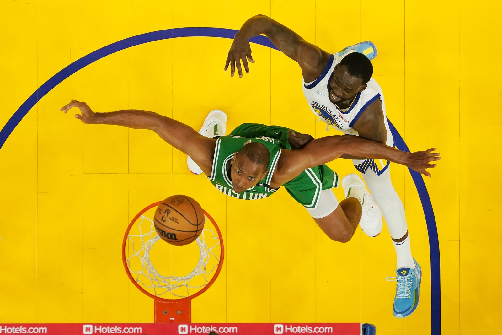 Draymond Green,atira na cesta sobre Al Horford,durante o terceiro quarto do jogo dois das finais da NBA — Foto: Ezra Shaw/Getty Images/AFP
