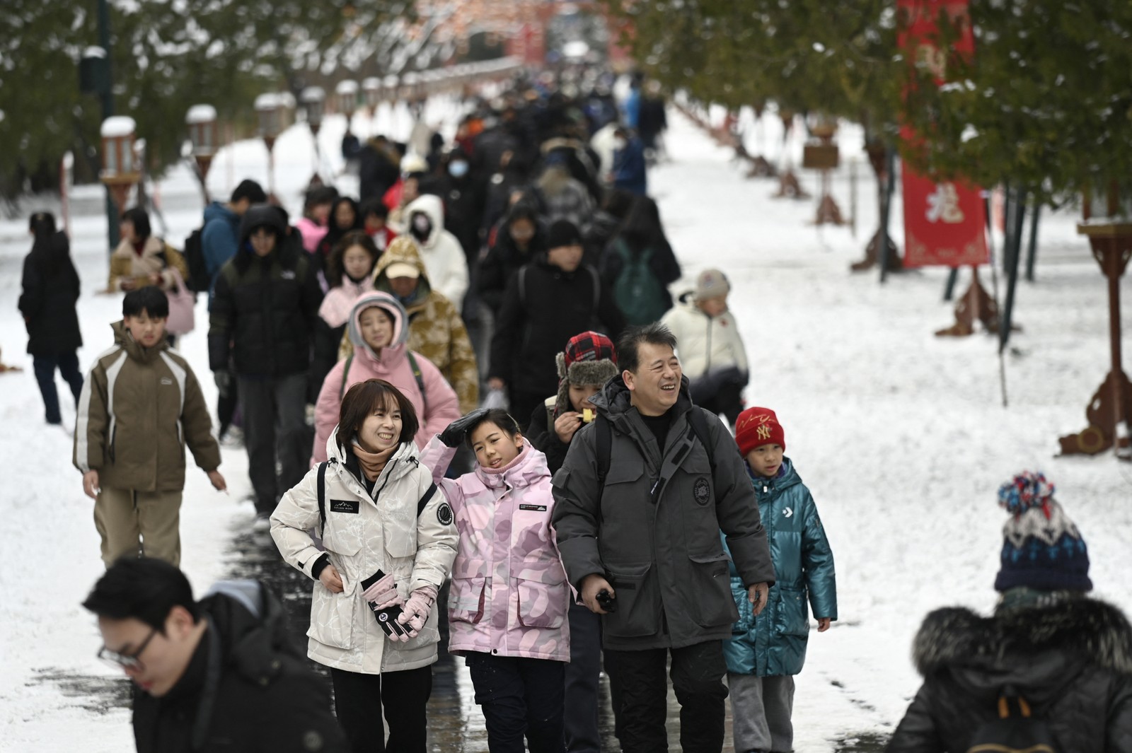 Pessoas visitam o Templo do Paraíso depois de nevasca em Pequim — Foto: WANG ZHAO/AFP
