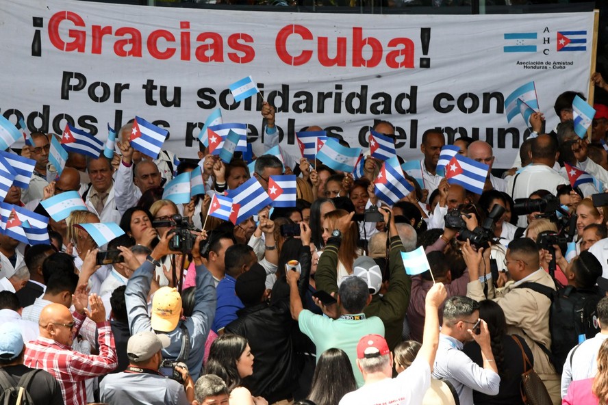 Médicos cubanos acenam com bandeiras de papel ao chegarem a Honduras,em 27 de fevereiro de 2024 — Foto: Orlando Sierra/AFP