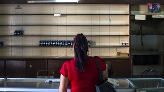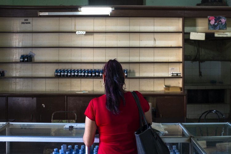 Mulher observa prateleiras vazias de uma farmácia na região central da capital cubana. Foto Yan Boechat