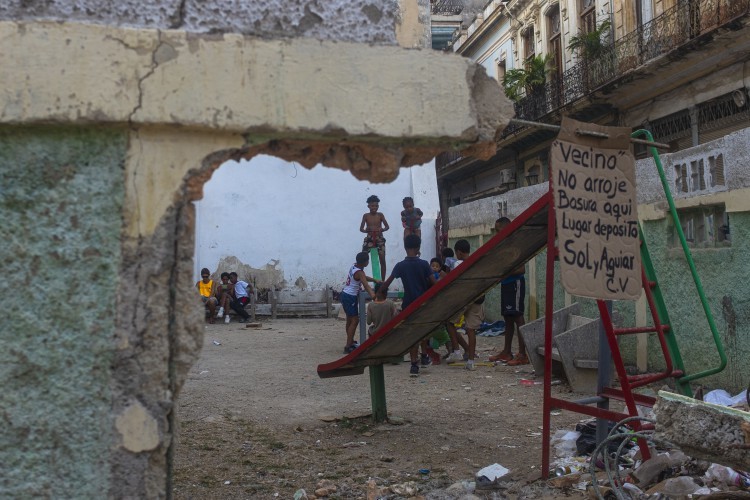 Crianças brincam em um parque infantil em ruínas que também serve de lixeira comunitária no centro de Havana. Foto Yan Boechat