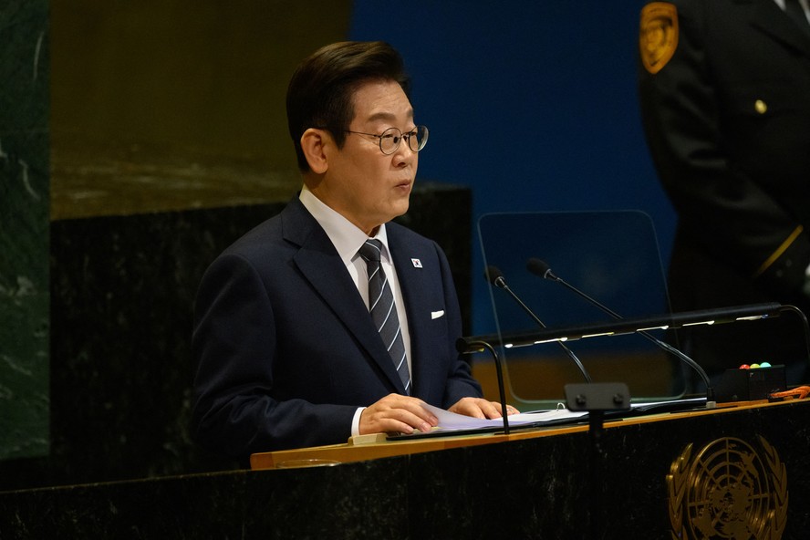 Presidente da Coreia do Sul,Lee Jae-myung,discursa no plenário da Assembleia Geral da ONU — Foto: Alexi J. Rosenfeld/AFP