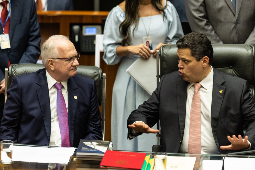 Edson Fachin e Davi Alcolumbre durante cerimônia de abertura do ano legislativo para a retomada das atividades parlamentares — Foto: Brenno Carvalho / Agência O Globo