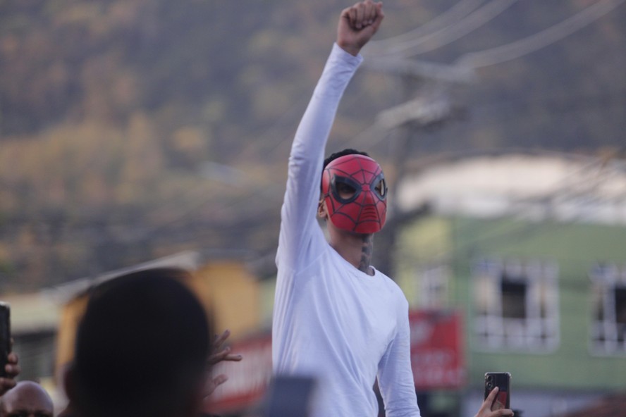 Oruam coloca a máscara de homem-aranha levada por um fã — Foto: Júlia Aguiar