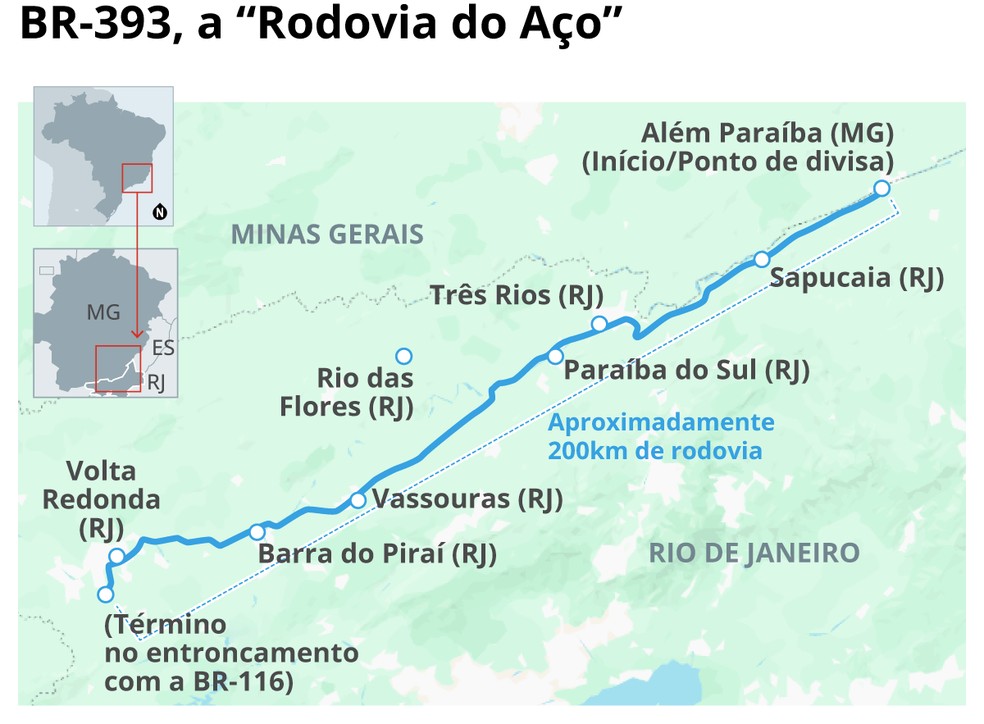 Oficialmente Rodovia Lúcio Meira,mais conhecida como Rodovia do Aço,a BR-393 tem cerca de 200 quilômetros e corta oito municípios: Além Paraíba,em Minas,e Sapucaia,Três Rios,Paraíba do Sul,Rio das Flores,Vassouras,Barra do Piraí e Volta Redonda,no Rio. A via faz conexões com a Rio-Juiz de Fora (BR-040) e com a Via Dutra (BR-116). E,apesar de estratégica para o turismo e para o escoamento da produção do Centro-Sul e do Médio Paraíba fluminense,virou essa bomba-relógio,com reclamações que se intensificam desde junho do ano passado,quando o governo federal encerrou a concessão da empresa responsável pela estrada desde 2018,a K-Infra,e passou a gestão ao Departamento Nacional de Infraestrutura de Transportes (Dnit).